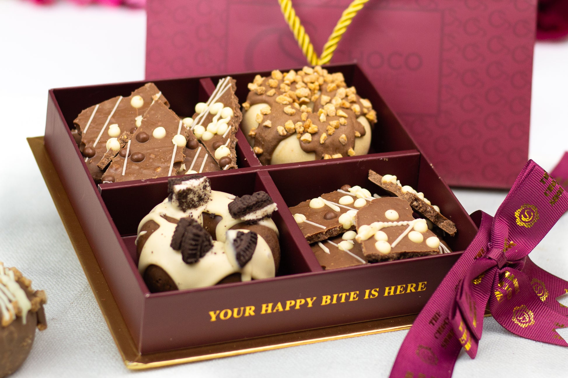 The arrangement contains 2 of our famous chocolate crunch Truffle donuts in different flavors and an assortment of our crunchy milk chocolate barq.