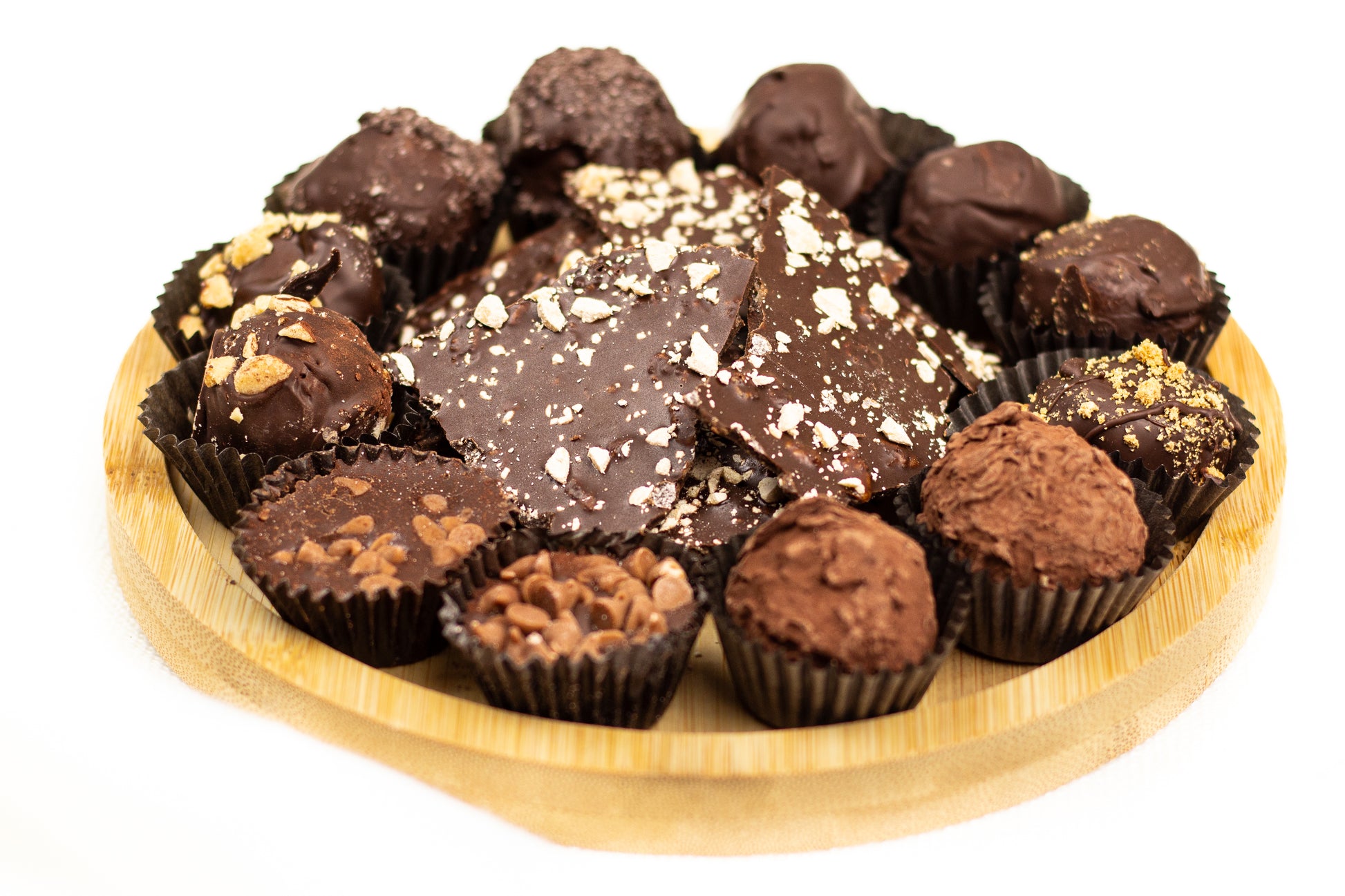 A beautiful platter of heavenly chocolates creating the perfect arrangement presented on a stunning wooden round platter overflowing with our most beloved parve chocolate treats. Thoughtfully curated and beautifully presented, this platter is the ultimate way to spread joy and sweetness!