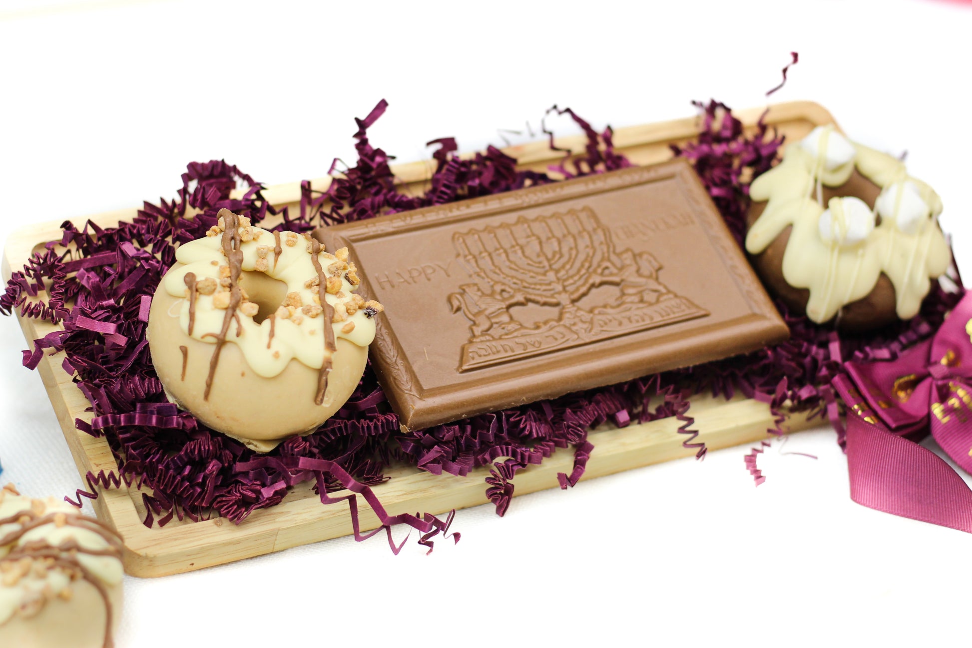 A charming, perfectly sized dairy Chanukah gift that delivers both elegance and irresistible flavor. Beautifully arranged on a wooden tray and wrapped with The Choco Shoppe’s signature maroon ribbon, this set is ideal for teachers, neighbors, hostess gifts, corporate appreciation, and small holiday gestures.