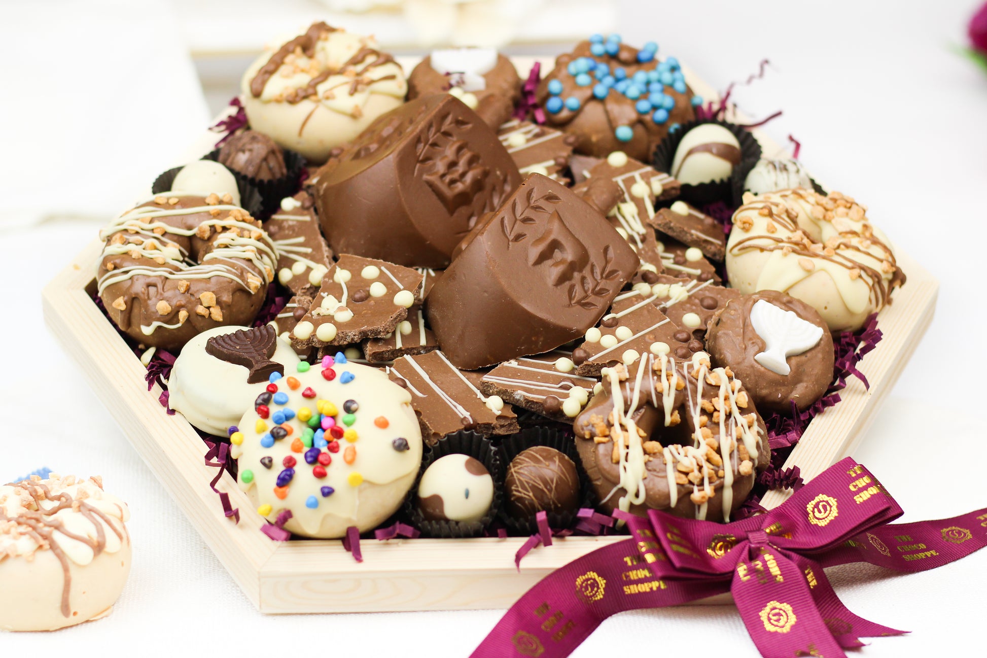 A stunning hexagon-shaped presentation overflowing with rich dairy chocolates, festive detail, and luxurious holiday craftsmanship. This platter showcases a beautiful balance of textures, shapes, and flavors — making it the perfect gift for Chanukah, simchas, corporate appreciation, teachers, and hosts.