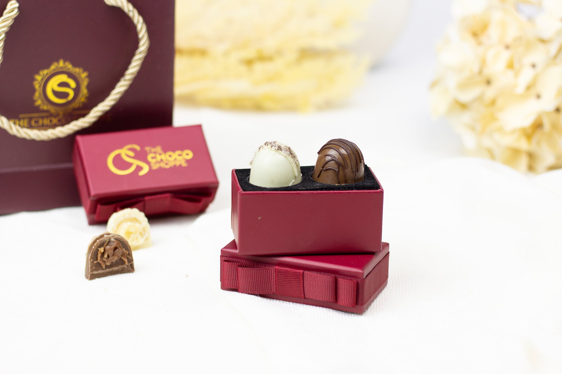 A beautifully curated gift featuring two artisan truffles, elegantly packaged in our signature maroon box. Small in size, big on impression.