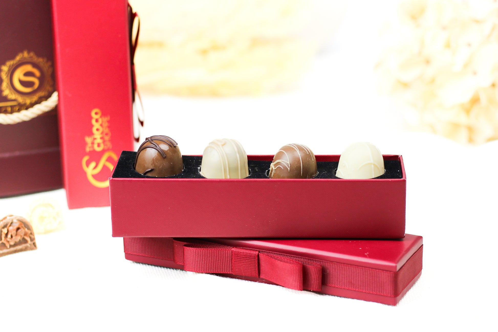 A sleek gift box featuring four handcrafted gourmet truffles. Rich flavors, beautiful presentation, and just the right touch of luxury.